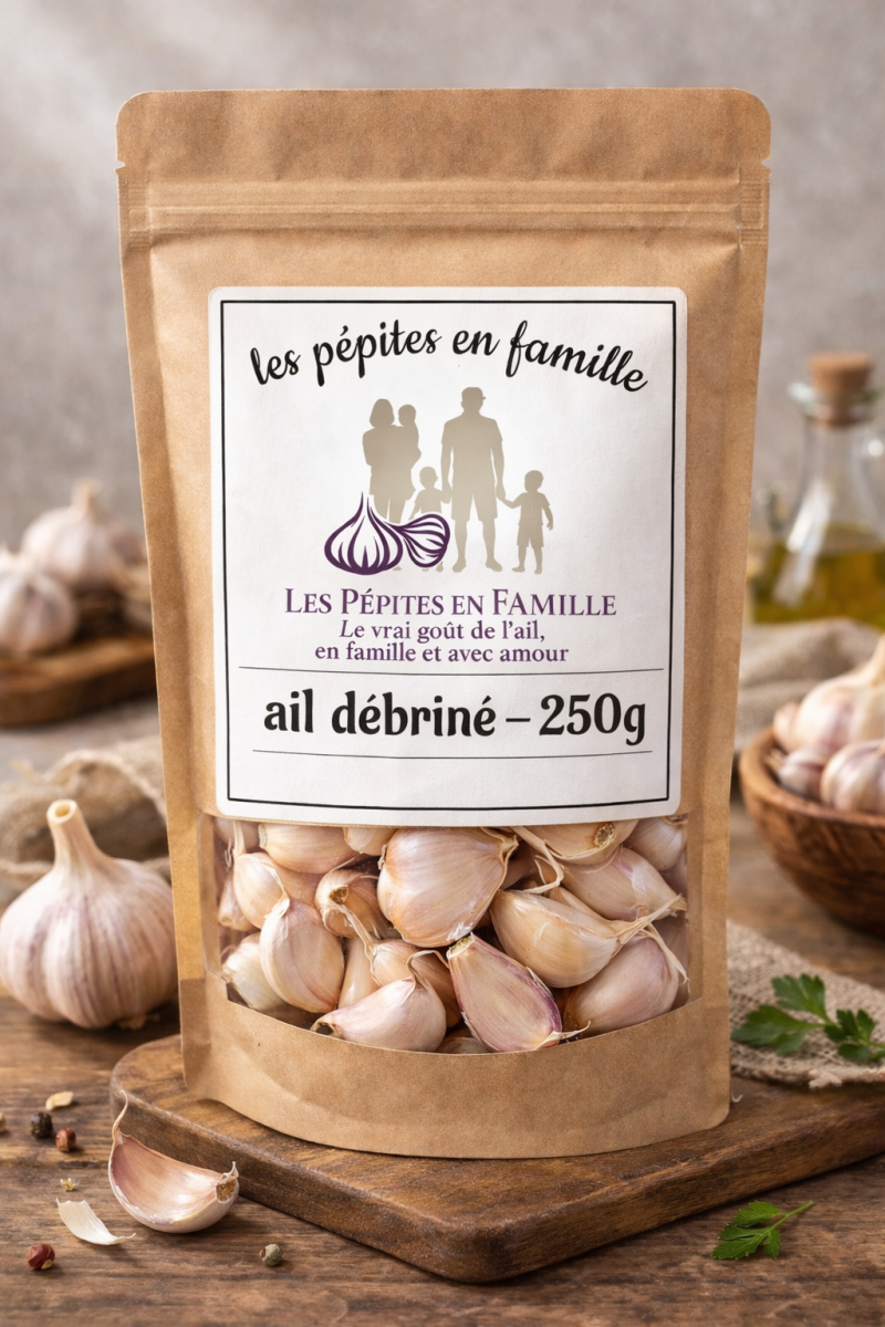 Cet ail est débriné et trié à la main avec soin. Il se présente sous forme de caïeux entiers, séparés de la tête, conditionnés en sachet d’environ 250 g, comme visible sur la photo.