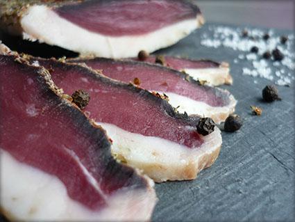 magrets de canard séché, tranché, sel, poivre, en poche sous vide