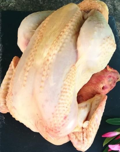Chapon de ferme élevé en plein air avec abats, prêt à cuire : 3.200 kg environ.