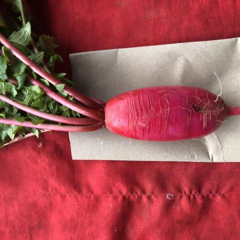 Radis de la taille d'un navet moyen, il est d'une jolie couleur vert amande à l'extérieur et d'un magnifique rose fushia moucheté de blanc à l'intérieur