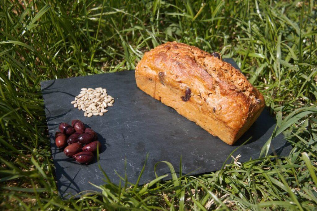 Farine de blé, de la passata (coulis de tomate), graines de tournesol, tomates séchées, herbes de provence et olives noires.