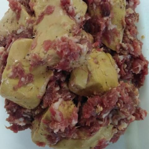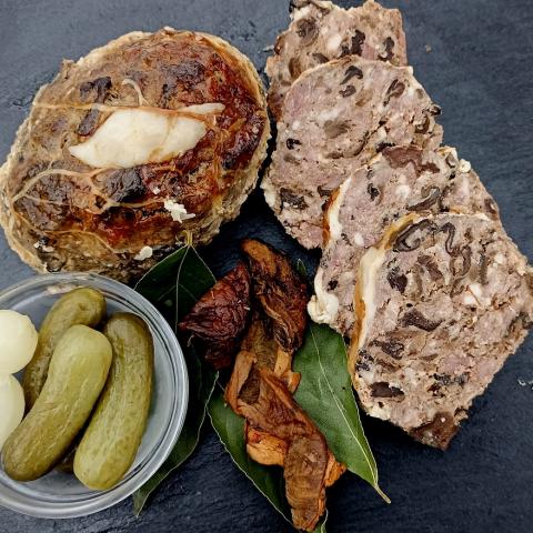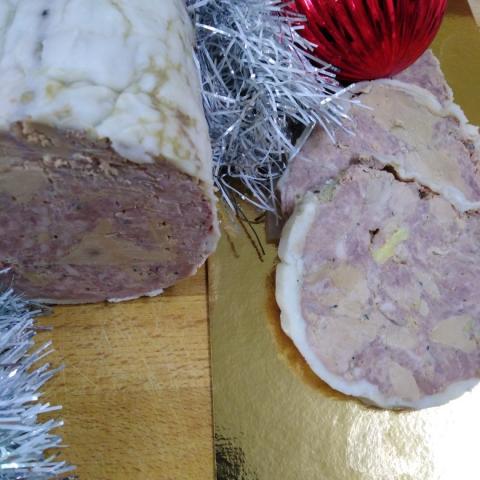 Maigre et poitrine de porc noir gascon, foie gras (25%) , oeufs, porto, sel, poivre Idéal pour farcir les chapons et volailles.